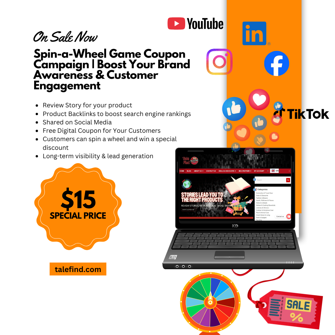 Increase your brand visibility and engage customers with TaleFind’s Spin-a-Wheel Game Coupon Campaign!